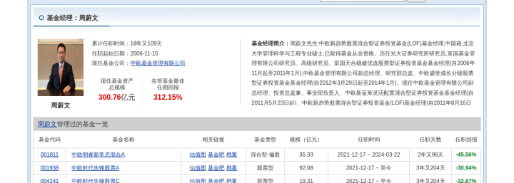 简历显示,周蔚文先生:中欧新趋势股票混合型证券投资基金(LOF)基金经理,中国籍,北京大学管理科学与工程专业硕士,已取得基金从业资格。历任光大证券研究所研究员,富国基金管理有限公司研究员、高级研究员、富国天合稳健优选股票型证券投资基金基金经理(自2006年11月起至2011年1月),中欧基金管理有限公司副总经理、研究部总监、中欧盛世成长分级股票型证券投资基金基金经理(自2012年3月29日起至2014年1月)。现任中欧基金管理有限公司副总经理、投资总监兼、事业部负责人、中欧新蓝筹灵活配置混合型证券投资基金基金经理(自2011月5月23日起)、中欧新趋势股票混合型证券投资基金(LOF)基金经理(自2011年8月16日起)。中欧精选灵活配置定期开放混合型发起式证券投资基金(自2016年12月01日起)。2017年07月31日至2022年3月18日担任中欧瑞丰灵活配置混合型证券投资基金基金经理。中欧匠心两年持有期混合型证券投资基金基金经理(自2019年06月11日起)。2021年12月17日至2024年03月22日任中欧明睿新常态混合型证券投资基金基金基金经理。2021年12月17日担任中欧时代先锋股票型发起式证券投资基金基金经理。曾任中欧洞见一年持有期混合型证券投资基金、中欧创新未来18个月封闭运作混合型证券投资基金基金经理。