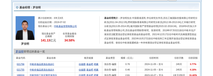 简历显示,罗佳明先生:中国香港居民,学位研究生学历,历任工银国际控股有限公司研究分析员(2011.04-2012.05),野村国际香港有限公司研究分析员(2012.06-2013.04),汇丰银行研究分析员(2013.05-2014.05),银河国际资产管理基金经理(2015.02-2018.04)。2018年4月加入中欧基金管理有限公司,历任基金经理助理/研究、投资经理。2019年07月02日担任中欧丰泓沪港深灵活配置混合型证券投资基金的基金经理。2021年12月17日任中欧时代先锋股票型发起式证券投资基金基金经理。2023年10月27日担任中欧恒利三年定期开放混合型证券投资基金基金经理。曾担任中欧港股通精选一年持有期混合型证券投资基金基金经理。