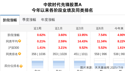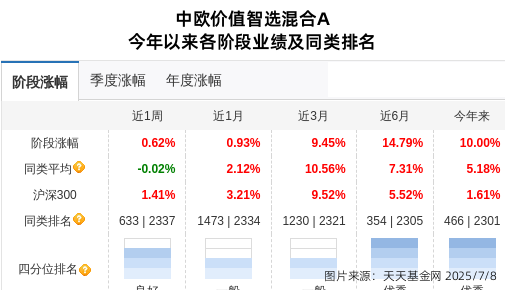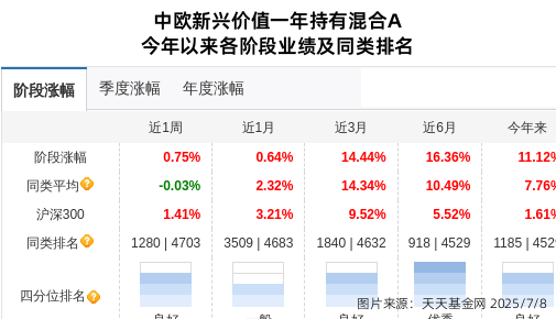 其中,中欧价值智选混合A今年以来收益率10.00%,同类排名466(总2301),中欧新兴价值一年持有混合A今年以来收益率11.12%,同类排名1185(总4529),中欧时代先锋股票A今年以来收益率4.90%,同类排名538(总993)。