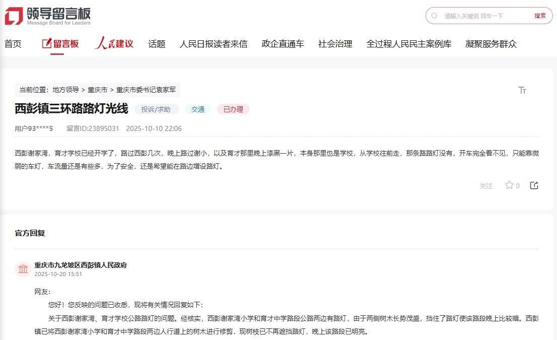 人民网重庆11月9日电 (陈琦)道路有坑不平、路灯长期不亮……近日,重庆多地群众在人民网“领导留言板”上反映道路安全问题,相关部门积极回应并推进了问题整改。