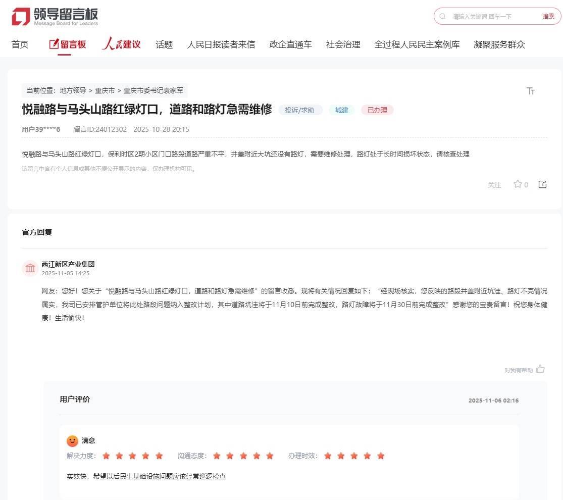 留言一周后,两江新区产业集团回复,已安排管护单位将此处路段问题纳入整改计划,其中道路坑洼将于11月10日前完成整改,路灯故障将于11月30日前完成整改。