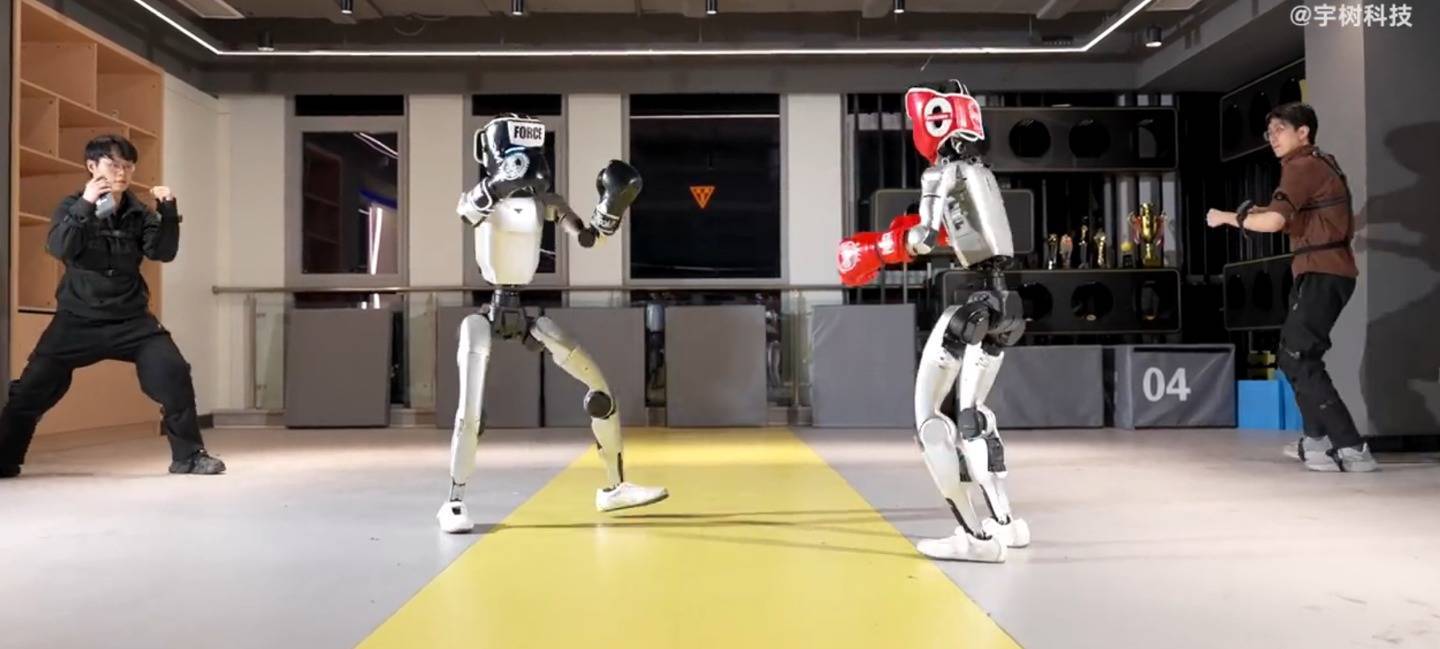 类似电影《铁甲钢拳》,在人类遥操作的控制之下,宇树的 G1 机器人能够同步人类动作,进行拳击比赛。
